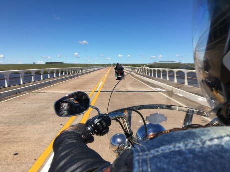 Domingo pela manhã, último dia de viagem. Motos na estrada cedinho pois queríamos chegar em Porto Alegre antes do movimento costumeiro de final de domingo. O vento este dia mostrou sua força, querendo nos empurrar mais rápido para casa. A passagem pela Reserva do Taim, sempre bonita, foi vencida com pilotagem difícil. Motos inclinadas, sendo arrastadas nas rajadas de vento, tornando cansativo esta parte da viagem. O banhado nos dois lados da pista apresentava ondas, tal a intensidade do vento. O capacete escamoteável abria a viseira nas rajadas mais fortes. Serviu para confirmarmos a necessidade da troca para capacetes mais adequados. Paramos em Pelotas para reabastecimento e comermos os famosos “doces de Pelotas”. O vento forte ainda nos acompanhou até próximo a Tapes. Depois foi substituído pelo calor, mas a tocada foi menos desgastante. A chegada em Porto Alegre sempre emociona com o visual das pontes e a visão da cidade deste lado do rio Guaiba. Paramos na entrada da cidade para a despedida depois de 2606 quilômetros rodados. Muitas experiências e sentimentos vividos nestes dias de ótima companhia. Como lição e dica para quem está planejando a sua: Vá logo, não espere um dia melhor, a troca da moto, uma desculpa qualquer. A vida passa e só depende da gente sair do sofá e deixar a preguiça de lado. Não haverá arrependimento.