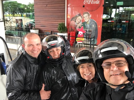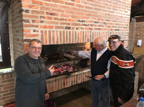 Depois de um bom café da manhã, motos carregadas, hora de partir. Entramos em Alegrete para fotografarmos a prefeitura. A Graça ligou para seu primo Márcio, e veio a informação: estava chovendo muito em Uruguaiana, com tudo que tem direito. Raios, trovoadas, vento forte. Finalizamos a colocação das roupas de chuva e fomos indo. O interessante é que em Alegrete estava 27ºC com céu parcialmente encoberto, sem cara de chuva. Voltamos para a estrada e na nossa proa o horizonte começou a ficar escuro, com uma faixa negra bem baixa. Quando encontramos as nuvens escuras, uma súbita diminuição de temperatura foi sentida. Os ventos começaram fortes e com eles a chuva. Diminuímos a velocidade e fomos tocando com cautela. Como a visibilidade estava boa continuamos assim até Uruguaiana. Chegamos no Tamandaré Iate Clube onde um churrasco nos esperava. Troca de roupa rápida no apartamento do Marcio e já estávamos nos deliciando com mollejas, chinchulin, assado de tiras, paletas de ovelha e vazios assados pelo João René. Umas cervejas geladas acompanharam o festival de carnes. Voltamos ao apartamento do Márcio, excelente anfitrião, para secarmos as roupas molhadas. A noite, para encerrar o longo dia, pizza com o Claudio e Maria do Horto, parentes da Graça.