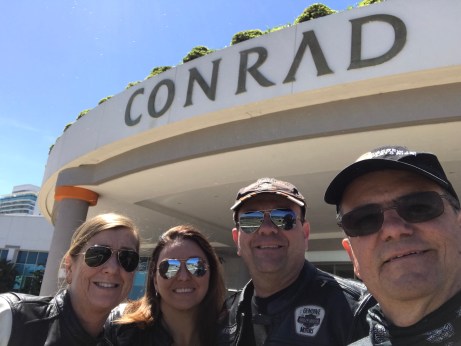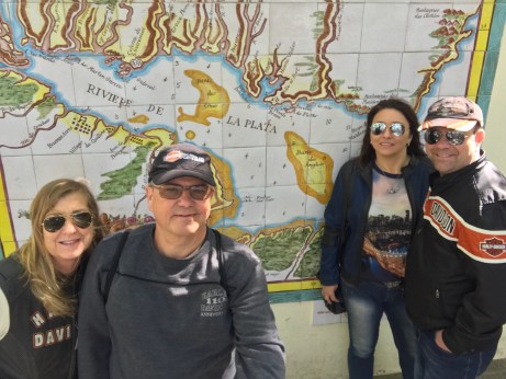 No 6º dia,café, motos carregadas e partimos para Montevideo. Na saída fizemos algumas fotos e combinamos abastecer na saída da cidade, onde tinha visto um posto em uma consulta ao Google Maps. Ou não vimos o posto ou saímos por outro lugar, e o resultado foi andarmos bastante antes de acharmos outro posto. Fica a dica: abasteça na saída de Colônia de Sacramento. Uma estrada fácil, bem asfaltada, com pista dupla em vários trechos e pouco movimento. Por volta do meio dia estávamos entrando em Montevideo. Pelo caminho que tomamos, a visão de Montevideo na chegada não foi das mais agradáveis. O hotel Days Inn Montevideo ficava em frente à rodoviária, num bairro sem muitos atrativos e com aspecto sujo. Para ajudar, o hotel confirmou que só poderíamos fazer o checkin as 14:00 horas. Fomos almoçar no shopping-rodoviária! Na volta, ainda esperando o quarto, a Graça e a Ingrid começaram a cochichar e olhavam o celular a procura de algo. Aí veio a proposta: em vez de ficarmos no outro dia parados em Montevideo, iríamos a Punta del Leste, que no nosso roteiro seria somente passagem já no retorno. E o melhor, acharam um preço bem razoável no Hotel Conrad! Reserva feita, cancelamento do segundo pernoite no hotel em Montevideo e o roteiro original estava modificado. Depois de alojados, partimos para conhecermos a cidade, fotos nos lugares pitorescos e a tradicional visita à loja da Harley Davidson de Montevideo. Preços salgados para os brazucas! A noite fizemos um passeio de turista. Conhecemos o bar Fun Fun. É um lugar muito interessante, mesmo voltado aos turistas. Uma dupla faz uma performance de músicas populares de cada país onde tem representantes na plateia. A parte engraçada é que em cada intervalo das músicas o cantor ameaçava cantar “Despacito”, a plateia vibrava mas acabou o show e nada do hit do momento. Aqui se encontra um dos menores palcos de tango do mundo. Um casal dança numa performance muito profissional e com um visual muito colorido e bonito. Peça o uvita , um drink da casa.